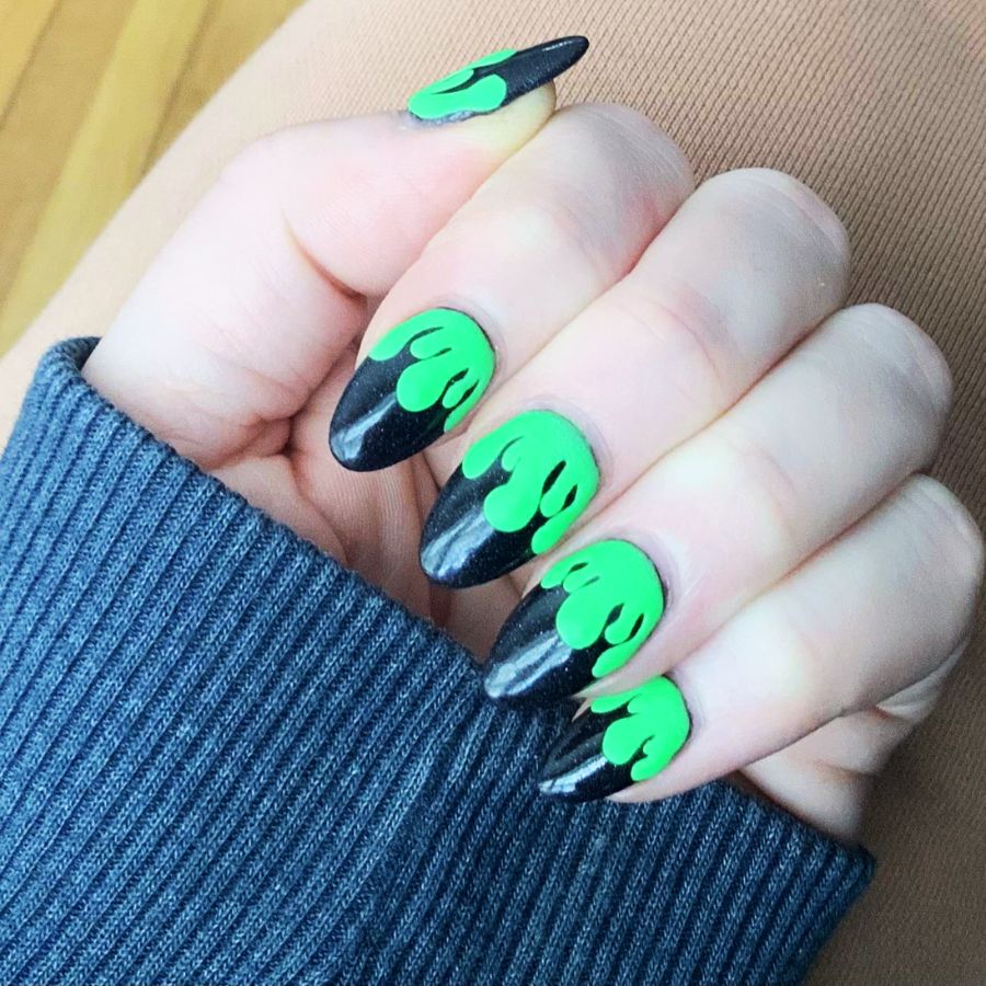 Neon Slime: Bright neon colors, especially greens and yellows, paired with spooky details such as drips or slime patterns, make nails pop during Halloween festivities. At Queen Nails, you can choose from various neon shades to create an eye-catching look that stands out.